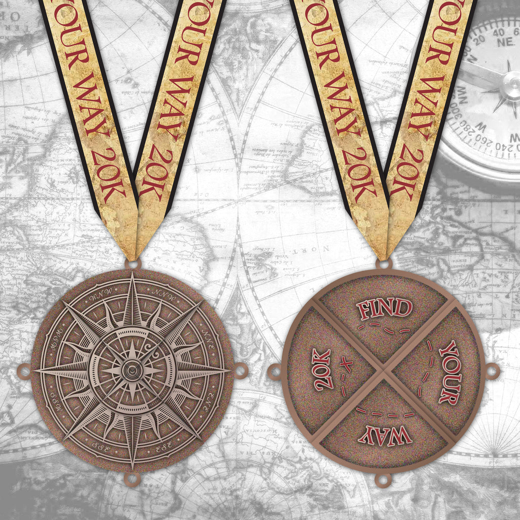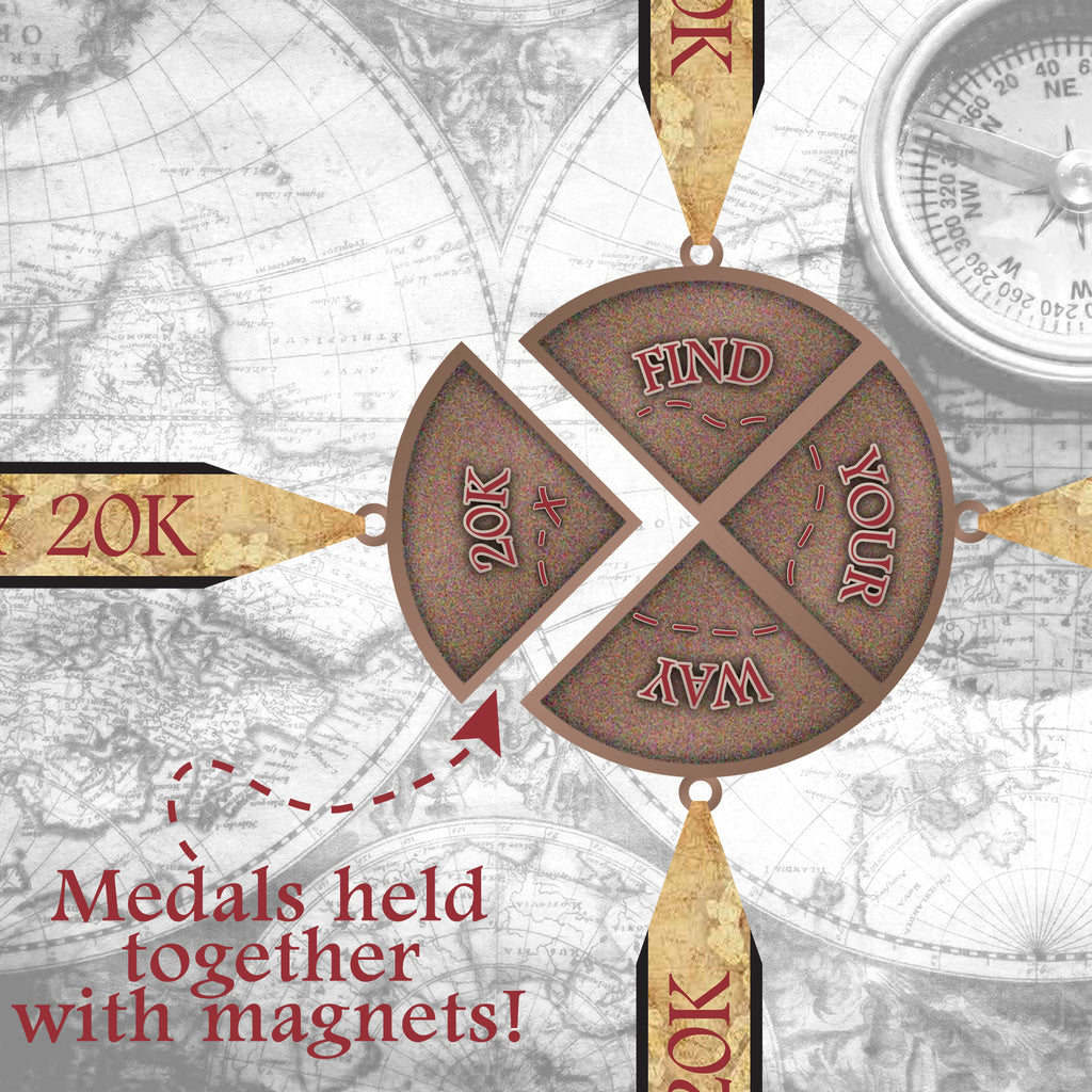 Take on a multi event challenge with the Find Your Way to 20K Virtual Event! This series of 5K’s has four award medals that hold together magnetically. When your four races are complete, you’ll have found your way to 20K and form a finished compass. Run or walk your 5K’s North, South, East, or West, challenging yourself along the way. Make each race component better than the one before in the Find Your Way to 20K challenge. This 4 part Compass Medal is 3D domed and fully blinded with electrosparkles.