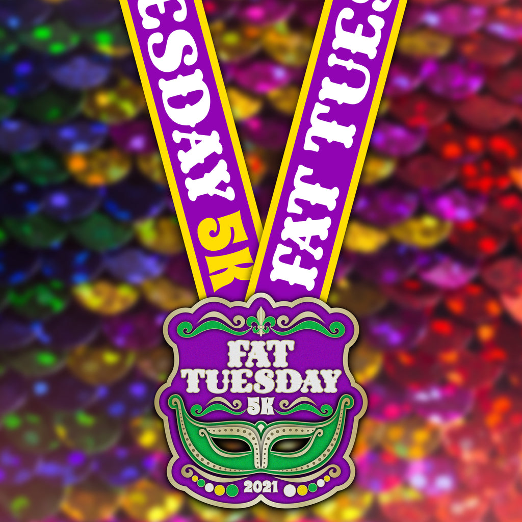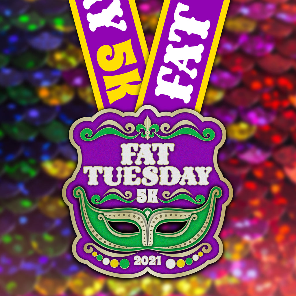 The Fat Tuesday 5K Virtual Run is a Virtual Carnival! Host your own Mardi Gras party on the streets and trails as you take on 5 Kilometers. Celebrate like Fat Tuesday any day that fits your schedule! Capture the spirit of New Orleans, without the travel. Get in the festive mood with your most colorful running clothes to complement this bright Masquerade 5K award medal and runner bib.