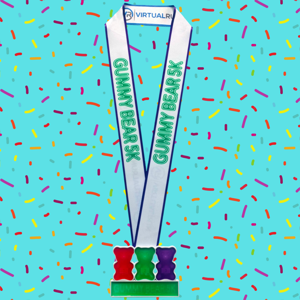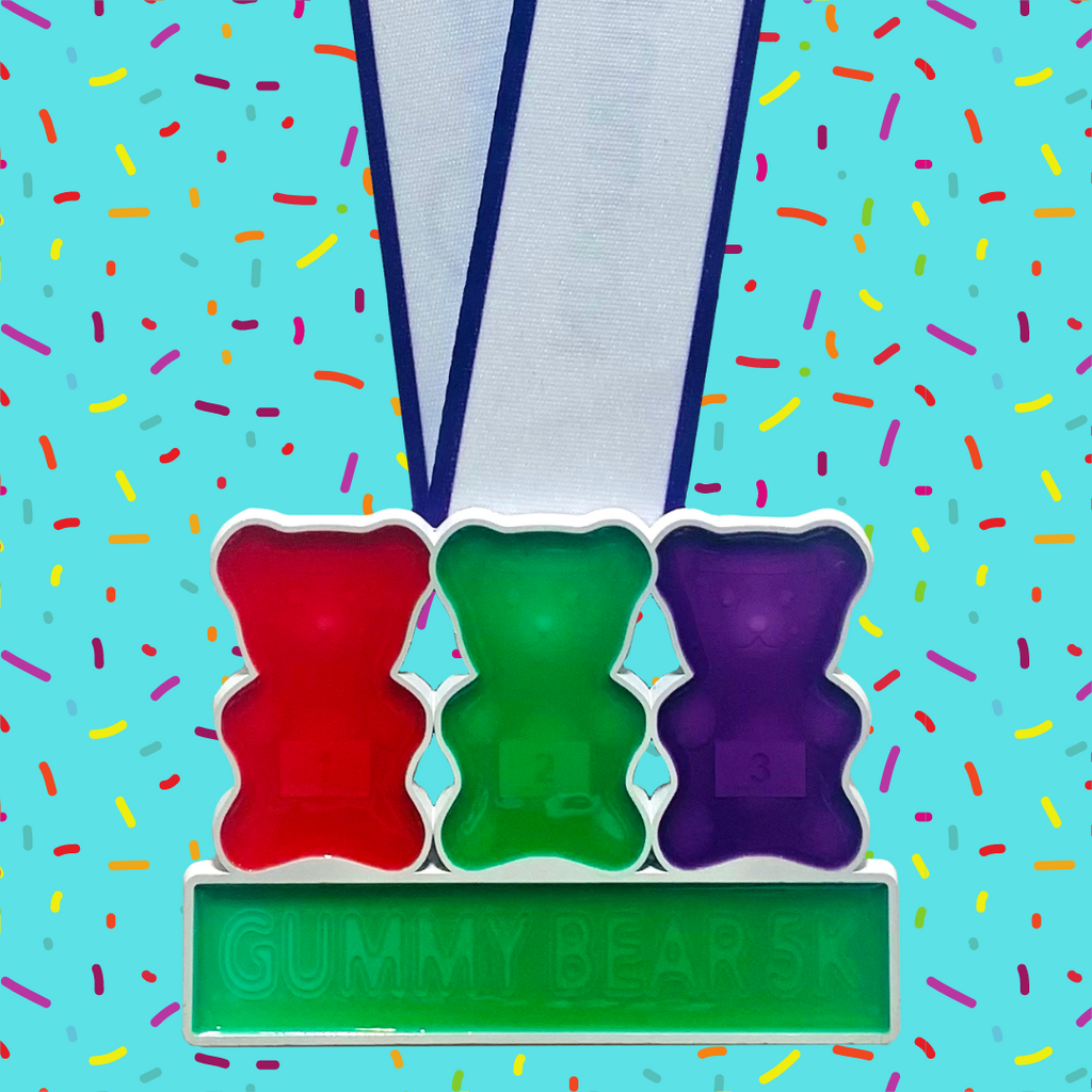Grab your partners and head out for the Gummy Bear 5K. These gummy little guys are ready to hit the town for 5K fun! Bring all your 5K pals together, either in person or virtually, for this fun Gummy Bear Virtual Race. Great for the kiddies as well! This 5K finishers medal with transparent gummy bears looks good enough to eat! Grab your bag of gummy bears and get outside to run or walk this fun virtual 5K with tasty gummy rewards. Pack comes with downloadable and personalizable runner bib!
