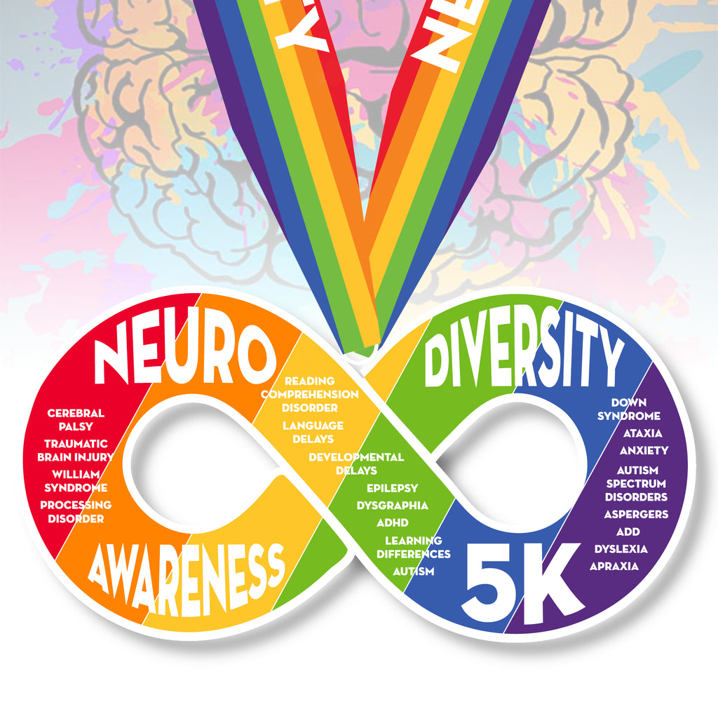 Within our human brain is an infinite variation in neuro-cognitive functioning. This infinite variation represents a range of differences in individual brain functions and behavioral traits. The rainbow infinity symbol celebrates human neurodiversity. Neurodiversity is understood to be a valuable form of human diversity, just as other forms of human diversity. The core of Neurodiversity is the understanding that regardless of diagnostic label, each of us possesses intrinsic value. Celebrate that intrinsic value with the Neurodiversity Awareness 5K. Get out in your neighborhood and spread the message of Neurodiversity. Each of us has value, wherever our place is. Spread some joy with this colorful Neurodiversity Infinity Symbol Medal and downloadable bib!