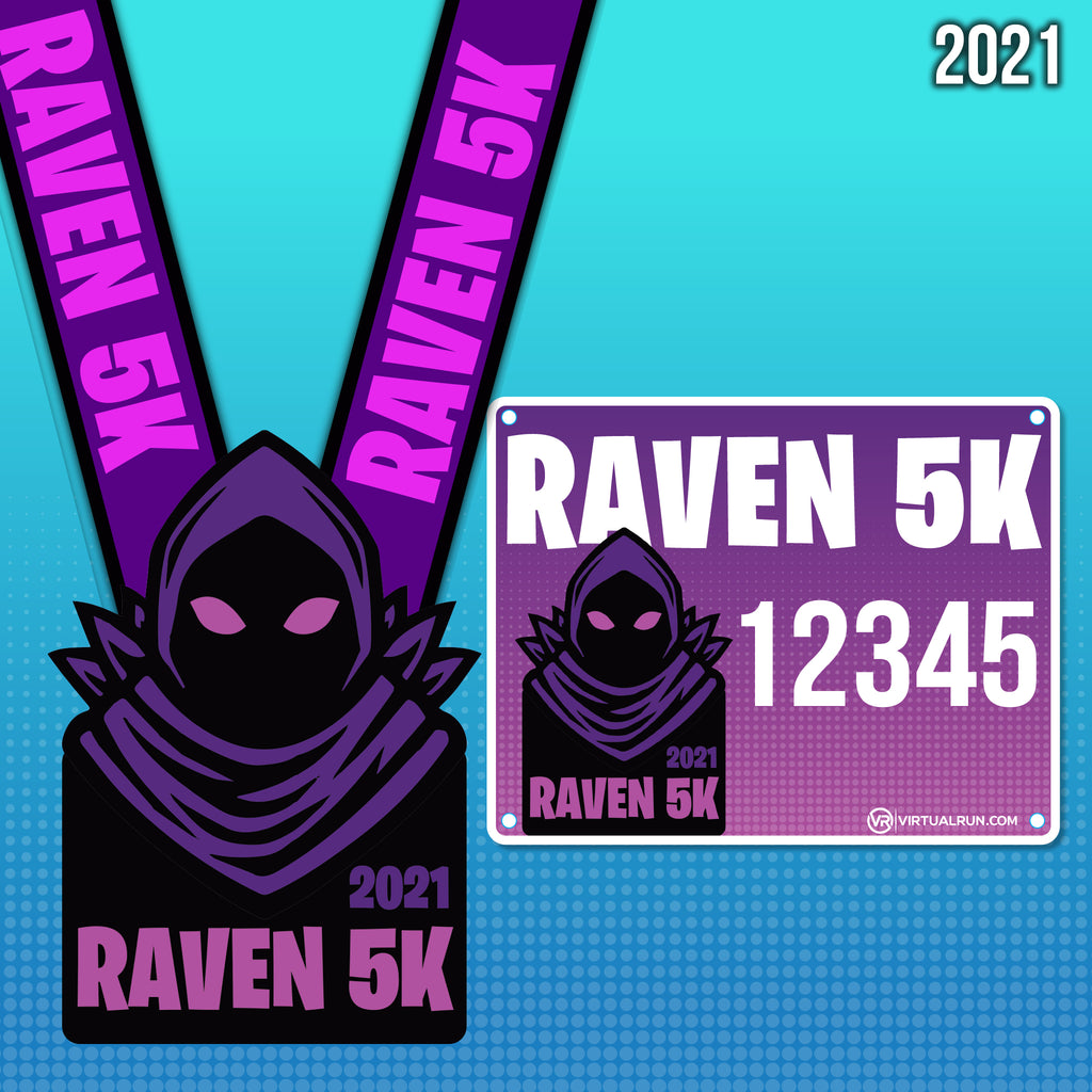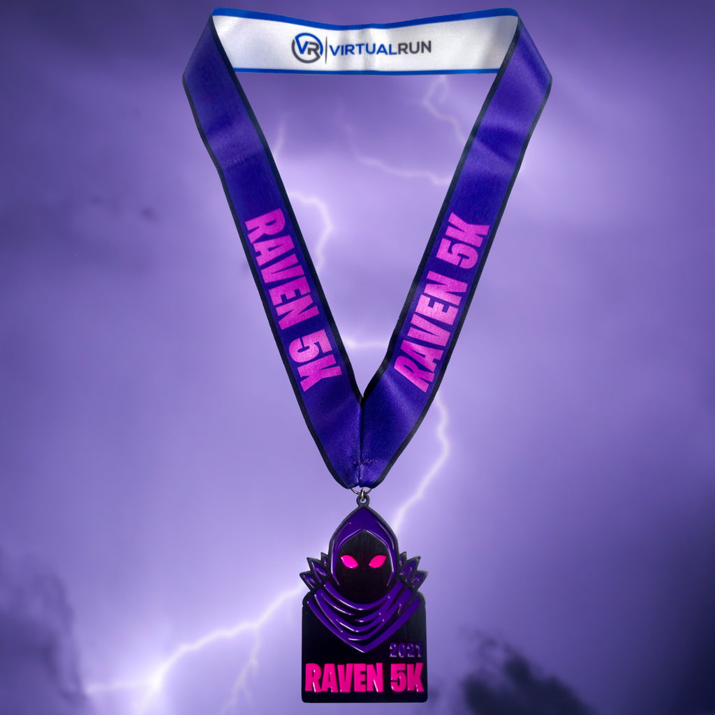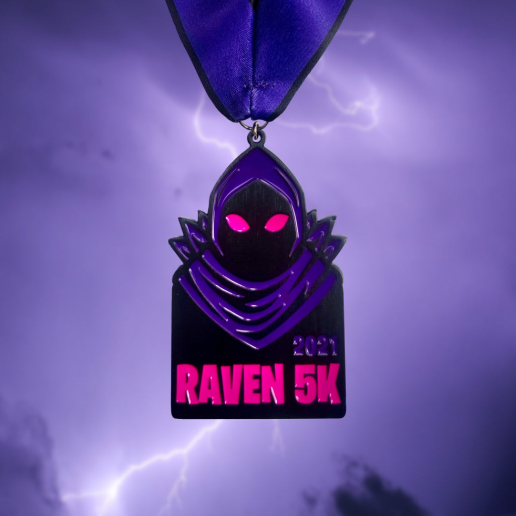 Raven is a legendary outfit in gaming. Rare, epic, highly praised. Raven is a brooding master of dark skies. Featuring an ominous purple glow, and a drooping black hood, this 5K finishers medal is a doomy tribute to the Raven.
