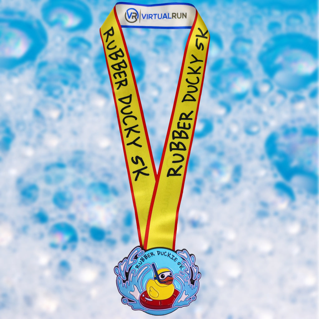 Rubber Duckie you’re the one, you make 5Ks so much fun! Rubber Duckie we’re awfully fond of you! The Rubber Duckie Virtual 5K event is dedicated to this classic bath time companion. Reward yourself for a 5K well done with this rubber duck finishers award medal. You can run, walk, or duck waddle your 5K at any time that works for you. Have family and friends join too! Round up your flock for a 5K that’s sure to be a quacking good time! This medal comes with a downloadable and personalizable runner bib!