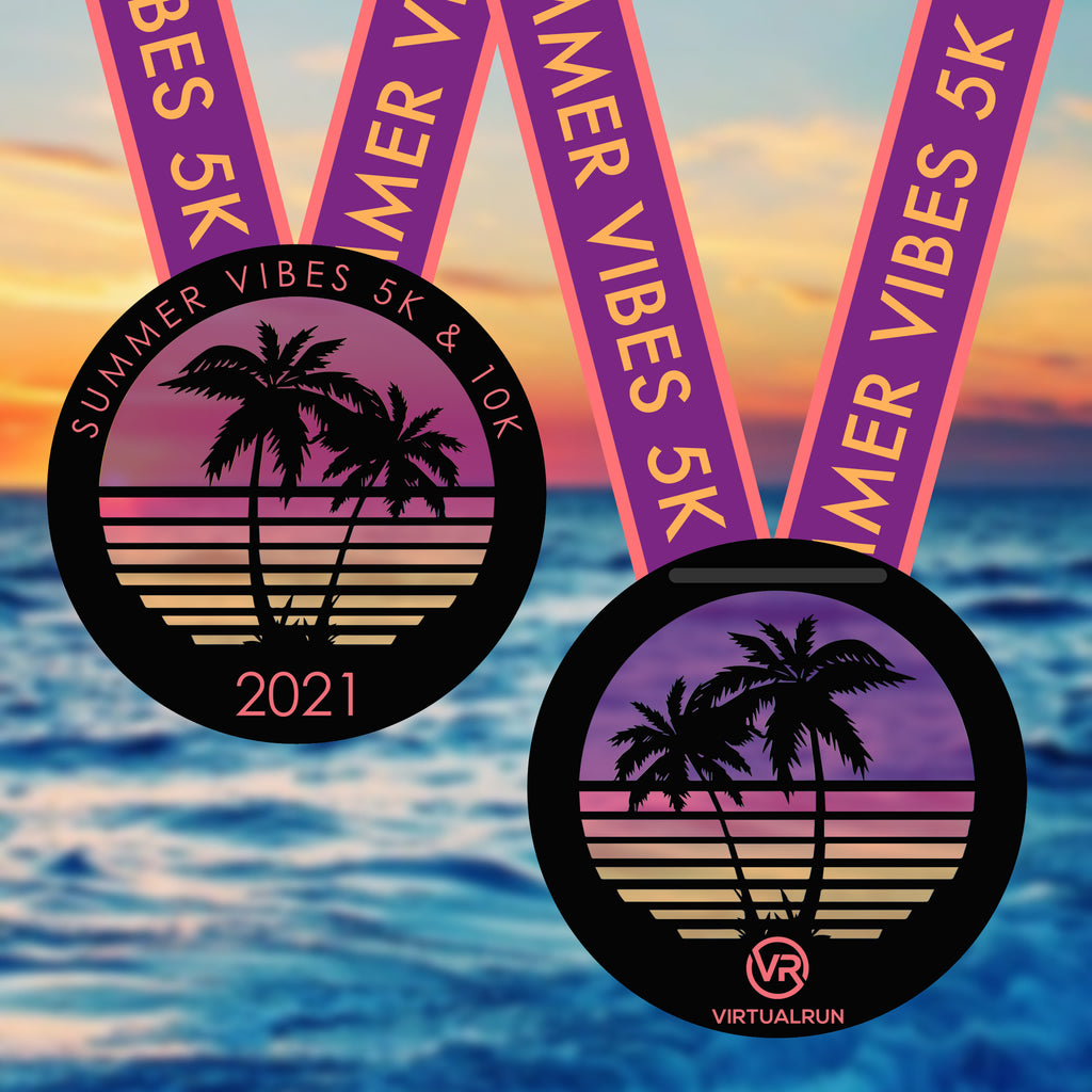 There’s nothing like those sweet summer vibes. Sunshine and summertime. Hit the beach, the park, or the trails for the Summer Vibes 5K or 10K Virtual Event. Get your summer bod ready with a healthy run or walk to soak in the sun. Popsicles, beach balls, sunshine and friends. Enjoy it all with this sweet Summer Vibes translucent sunset finishers medal. There’s no better time than the Summertime to get out for a 5K or 10K.